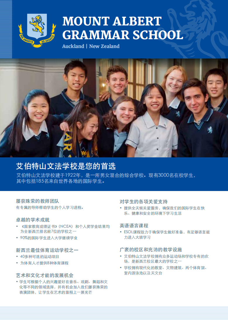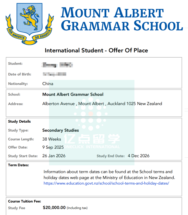 G同学将在2026年1月入读新西兰奥克兰的知名学府 Mt Albert Grammar School (MAGS),从Year 12开始学习。这对于国际学生来说既是挑战,也是快速成长的机会。